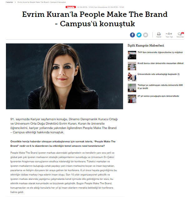 91. sayımızda Kariyer sayfamızın konuğu, Dinamo Danışmanlık Kurucu Ortağı ve Universum Orta Doğu Direktörü Evrim Kuran. Kuran ile üniversite öğrencilerini, kariyer yollarında yakından ilgilendiren People Make The Brand – Campus etkinliği hakkında konuştuk.
